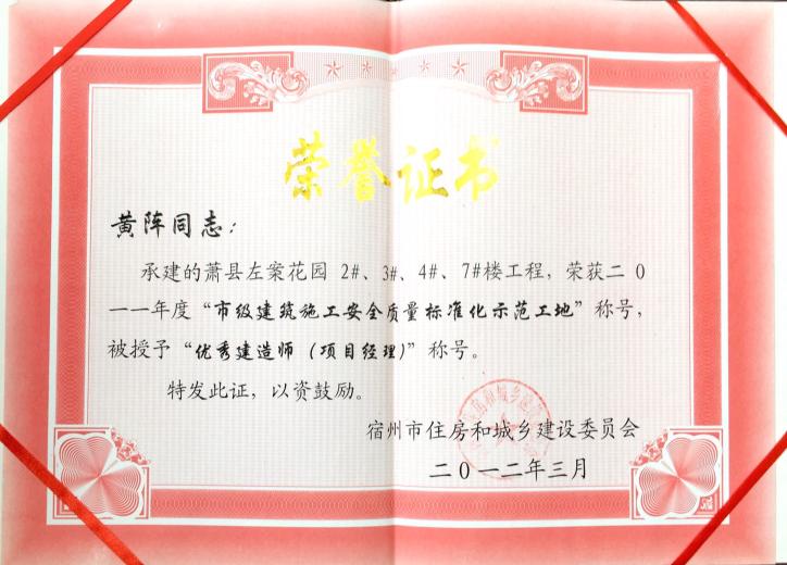 黄阵承建——萧县左岸花园2#、3#、4#、7#楼工程被授予优秀建造师(项目经理)