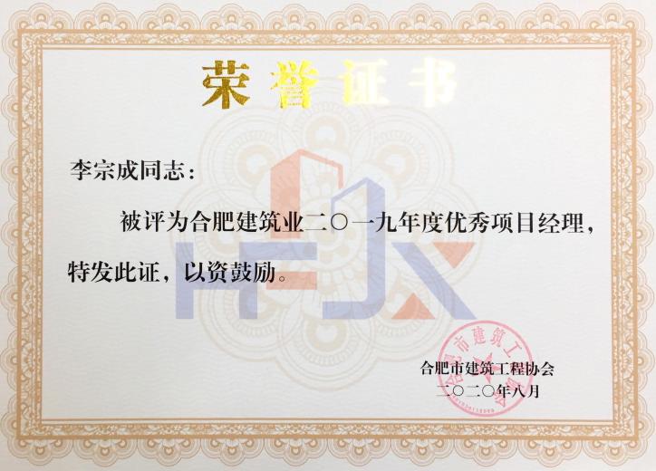 合肥市建筑业2019年度优秀项目经理——李宗成