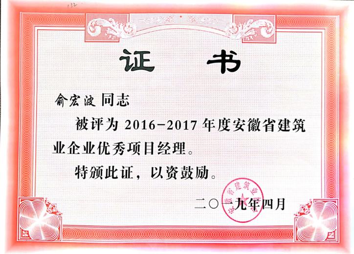 2016-2017年安徽省建筑业优秀项目经理——俞宏波