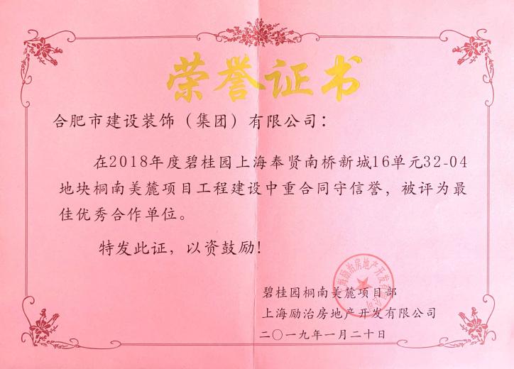2018年度碧桂园上海奉贤南桥新城16单元32-04地块桐南美麓项目工程建设者重合同守信誉,被评为最佳优秀合作单位
