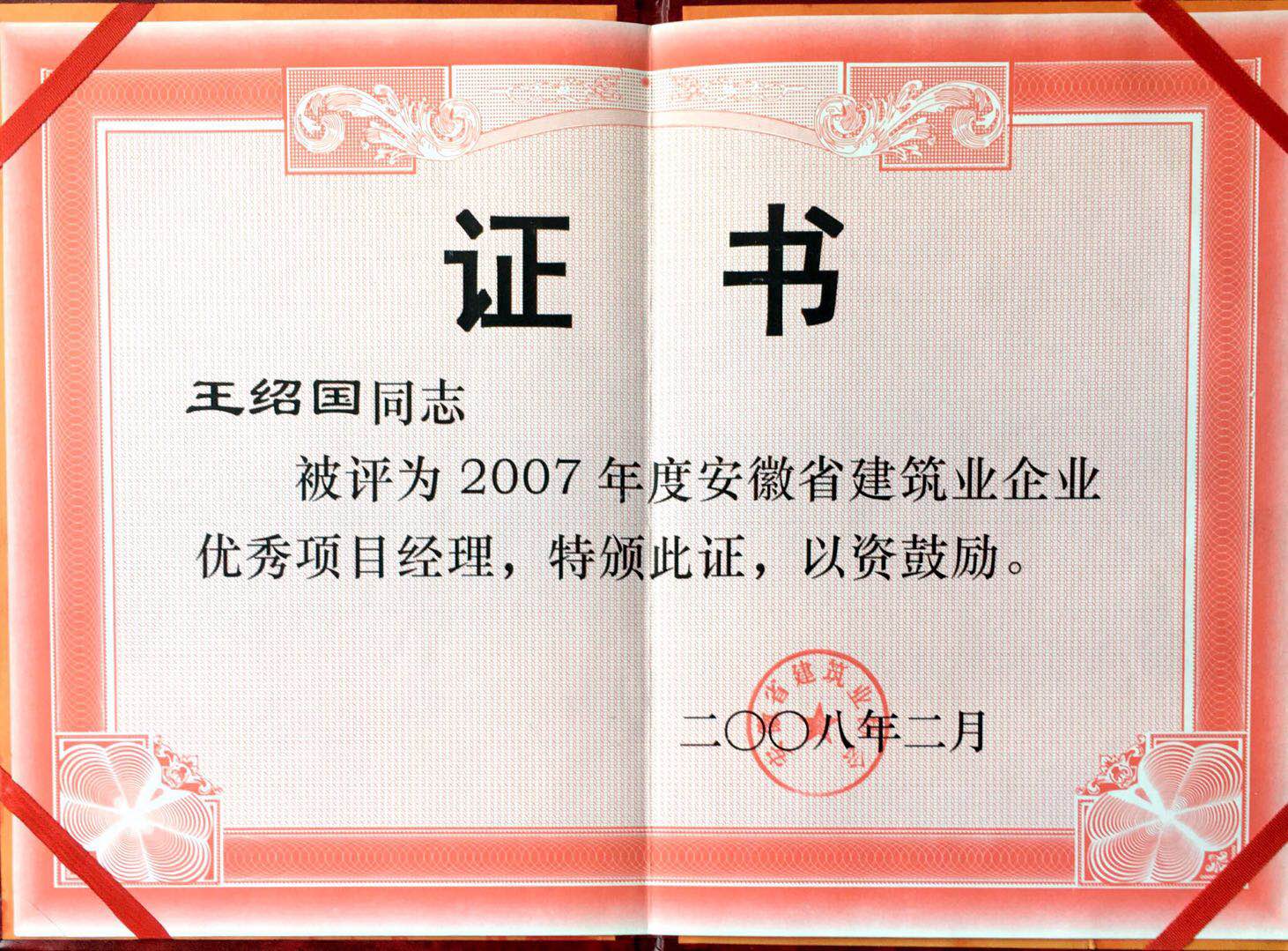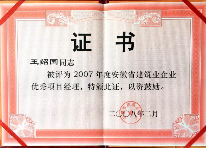 >2007年度安徽省建筑业优秀项目经理王绍国