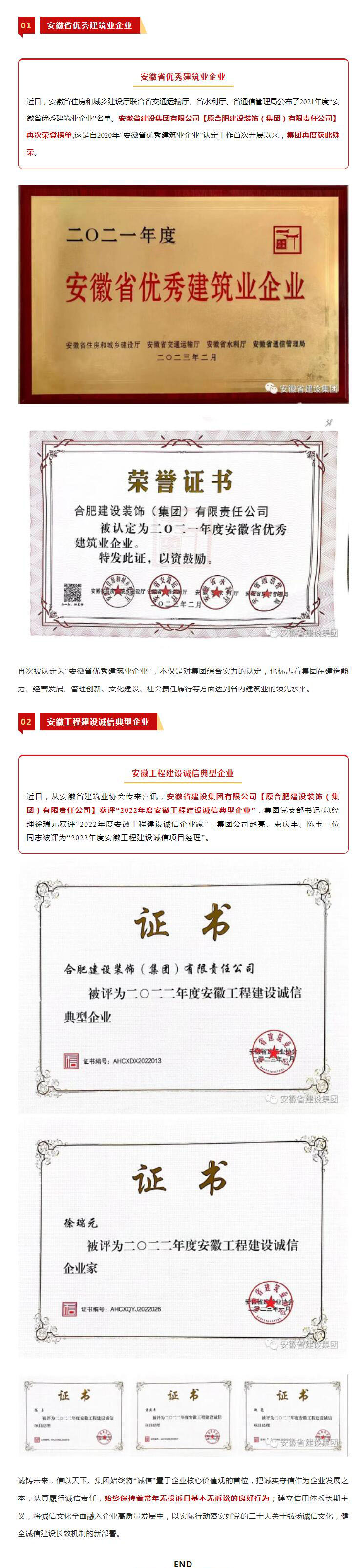 喜报 | 集团再次荣获“安徽省优秀建筑业企业”等多项荣誉
