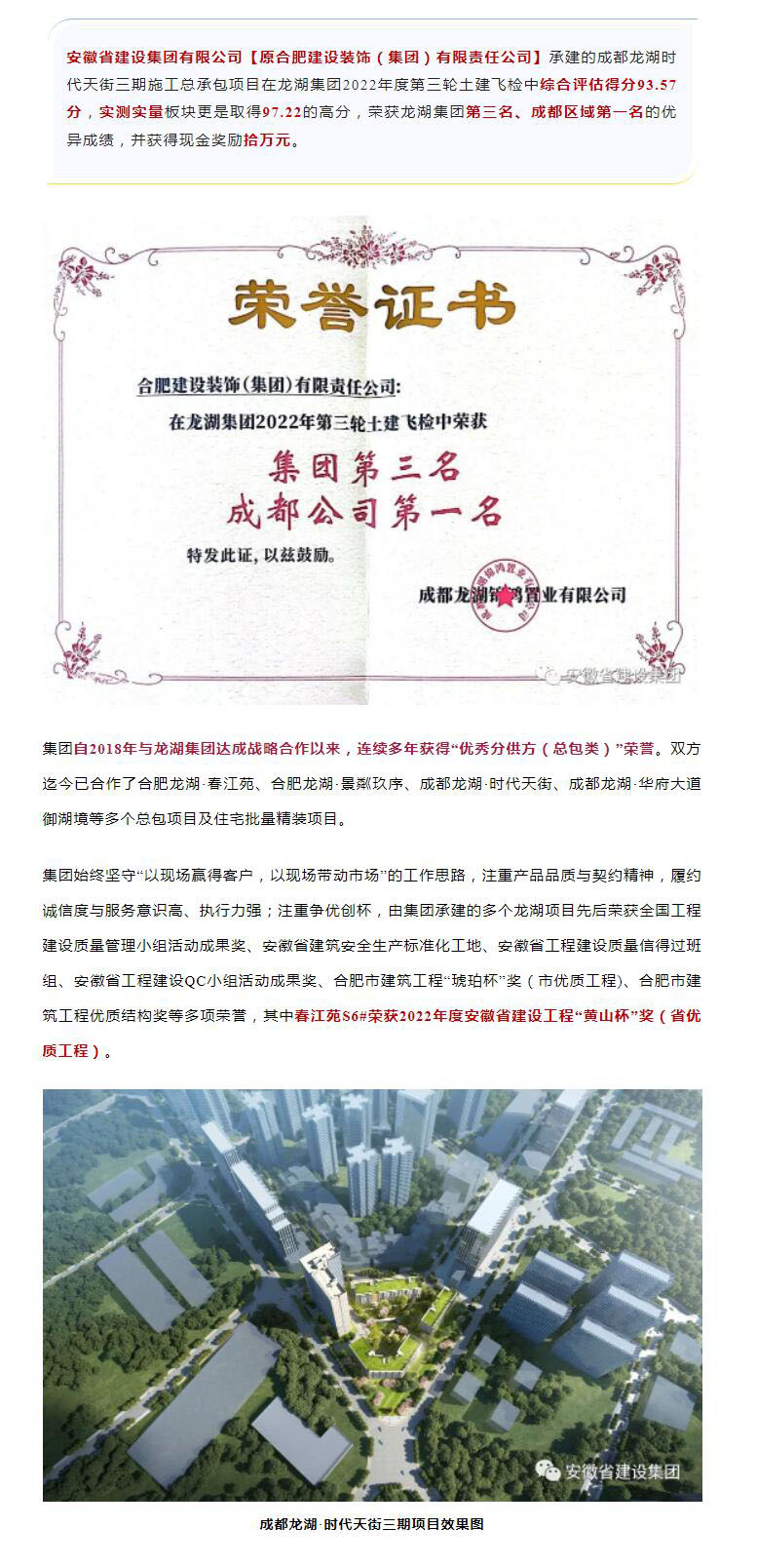 >成都时代天街项目土建飞检荣获龙湖集团第三名及成都区域第一名